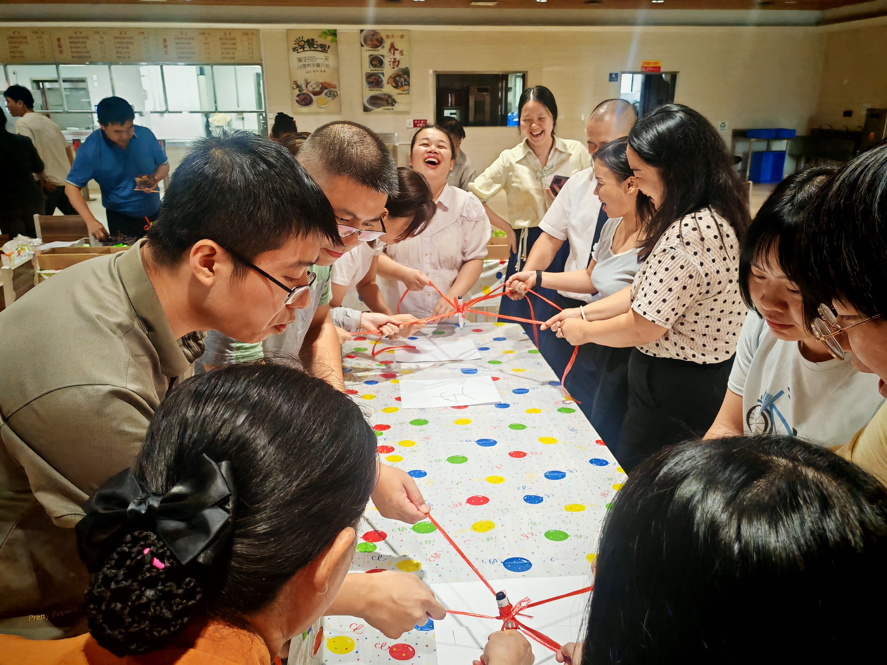 這是最考驗(yàn)團(tuán)隊(duì)協(xié)作的環(huán)節(jié)。六人一組,每人牽一根繩子共同控制筆尖,寫出一行字或畫出圖案。看似簡(jiǎn)單,卻讓人手忙腳亂,常常一筆下去就引得全場(chǎng)大笑。但最終,大家齊心協(xié)力完成作品時(shí),也收獲了滿滿成就感。